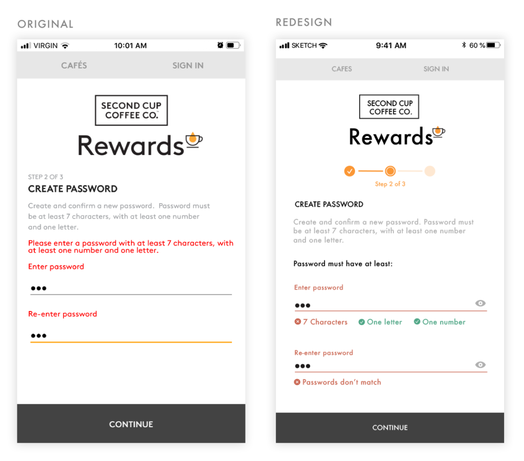 In the redesign, instead of a generic error message users are informed exactly what criteria is not being met.