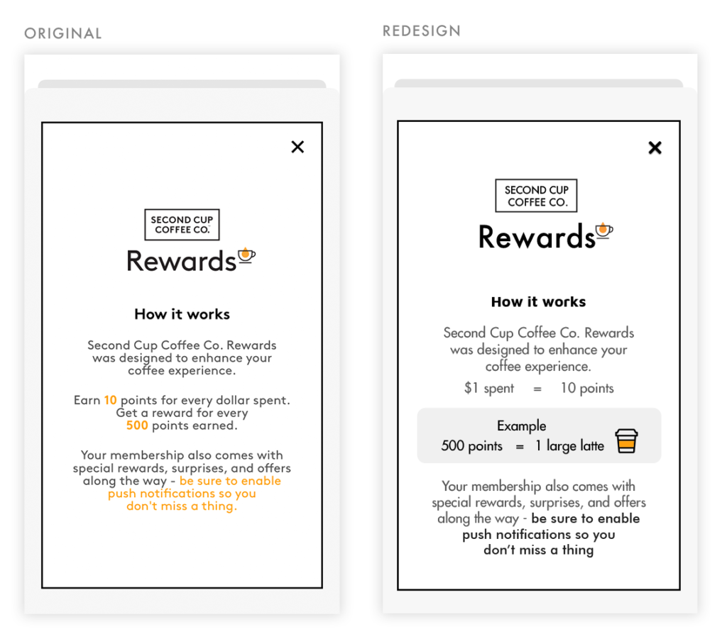 A vague explanation, especially if the user is a first time customer. Also, there’s high cognitive load making the user calculate the value of the points: “Earn 10 points for every dollar spent, and get a reward every 500 points earned” Finally, it is not clear what kind of reward they get. Giving examples of what this reward is would be easier to understand than just numbers and points.