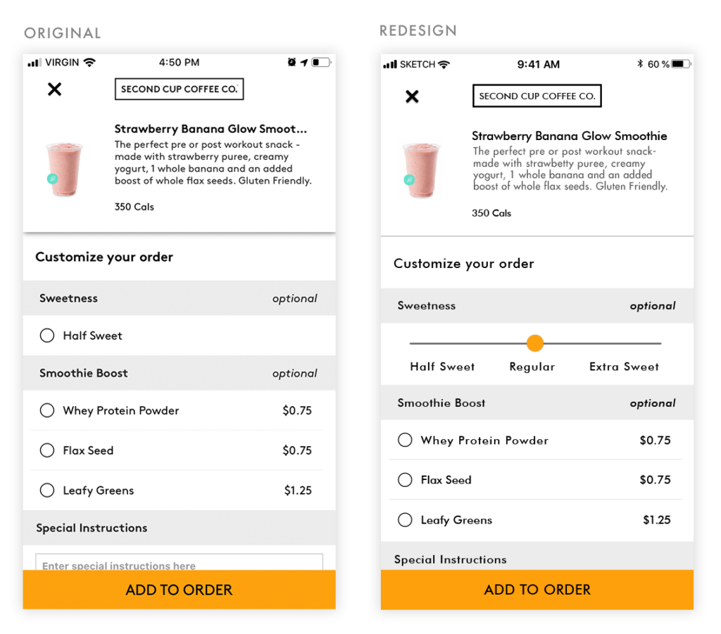 I created a slider to give the user more freedom to customize their drinks, instead of presenting just one more option apart from the regular one.