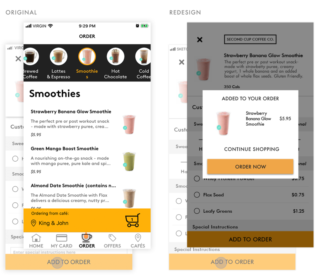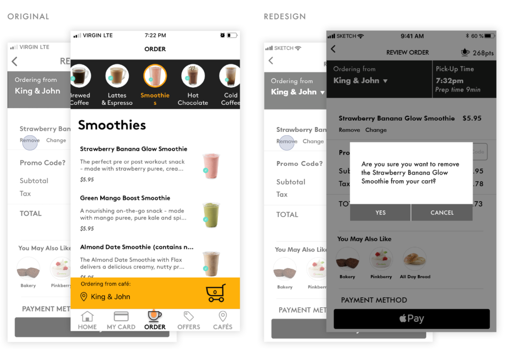 Right after removing an item from the cart in the original design, users were automatically redirected to the order menu. With a modal box for confirmation, users will prevent errors by confirming the pressed choice.