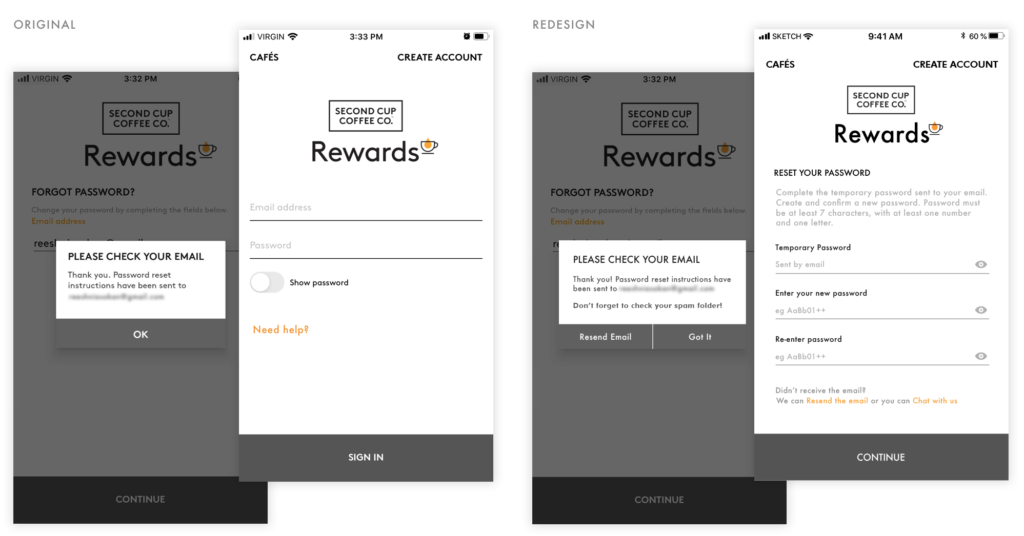 For a potential redesign, reminders to check the spam folder and an option to resend the email were created.