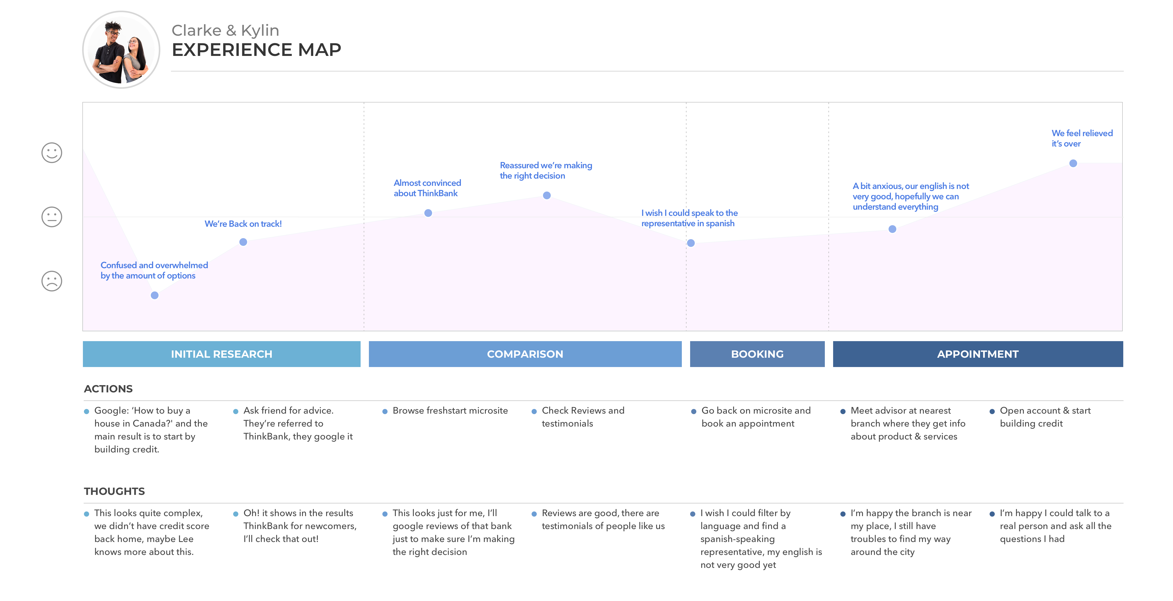 We created 15 steps showing how the user moves through the problem space, starting with their research online to finally booking their appointment with the bank.