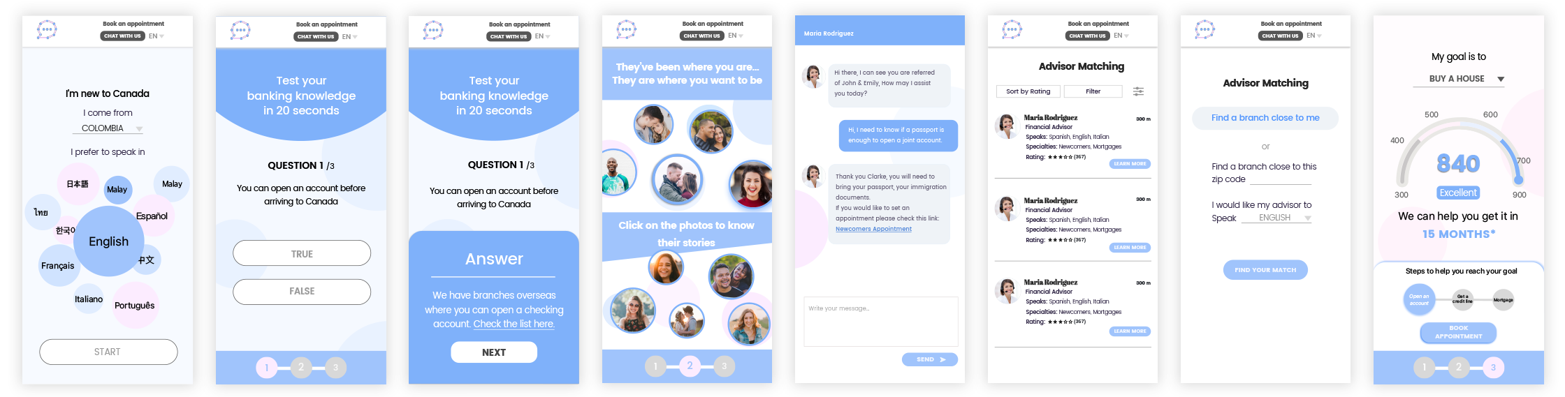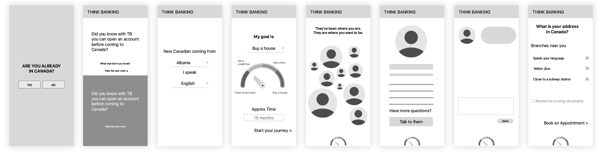 They can read the story of John and Emily for example: the goals they had when they came to Canada, their advice for newcomers, what products they have with ThinkBank and even the contact information of their financial advisor in case they want to contact them directly. Here they can get in touch with this couple and ask questions. They’ve found people that they share language, values or a similar background with who are currently partnered with ThinkBank. At this point, they can also book an appointment with ThinkBank and if they’re not completely sold on the idea, they can go back to the main screen.