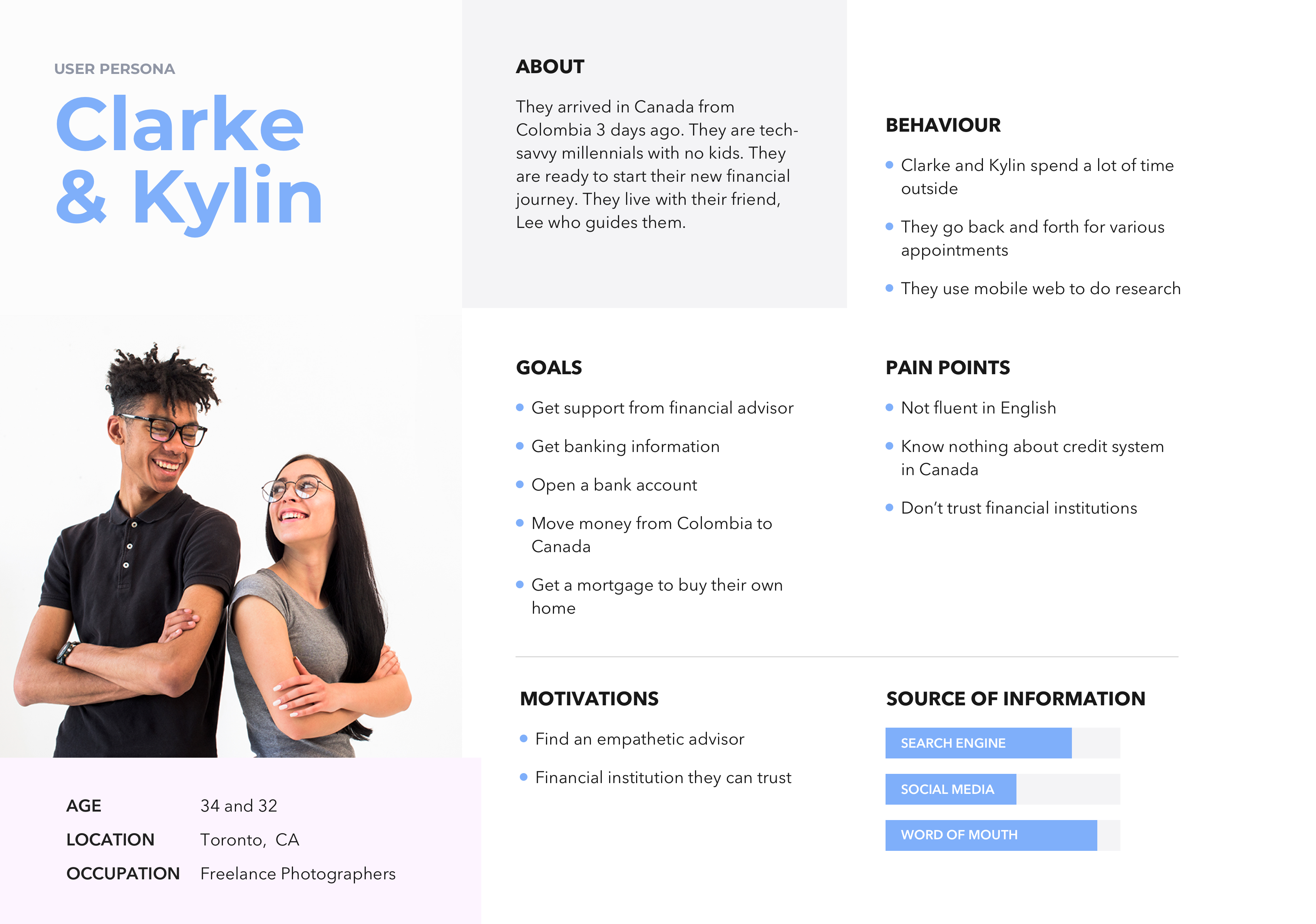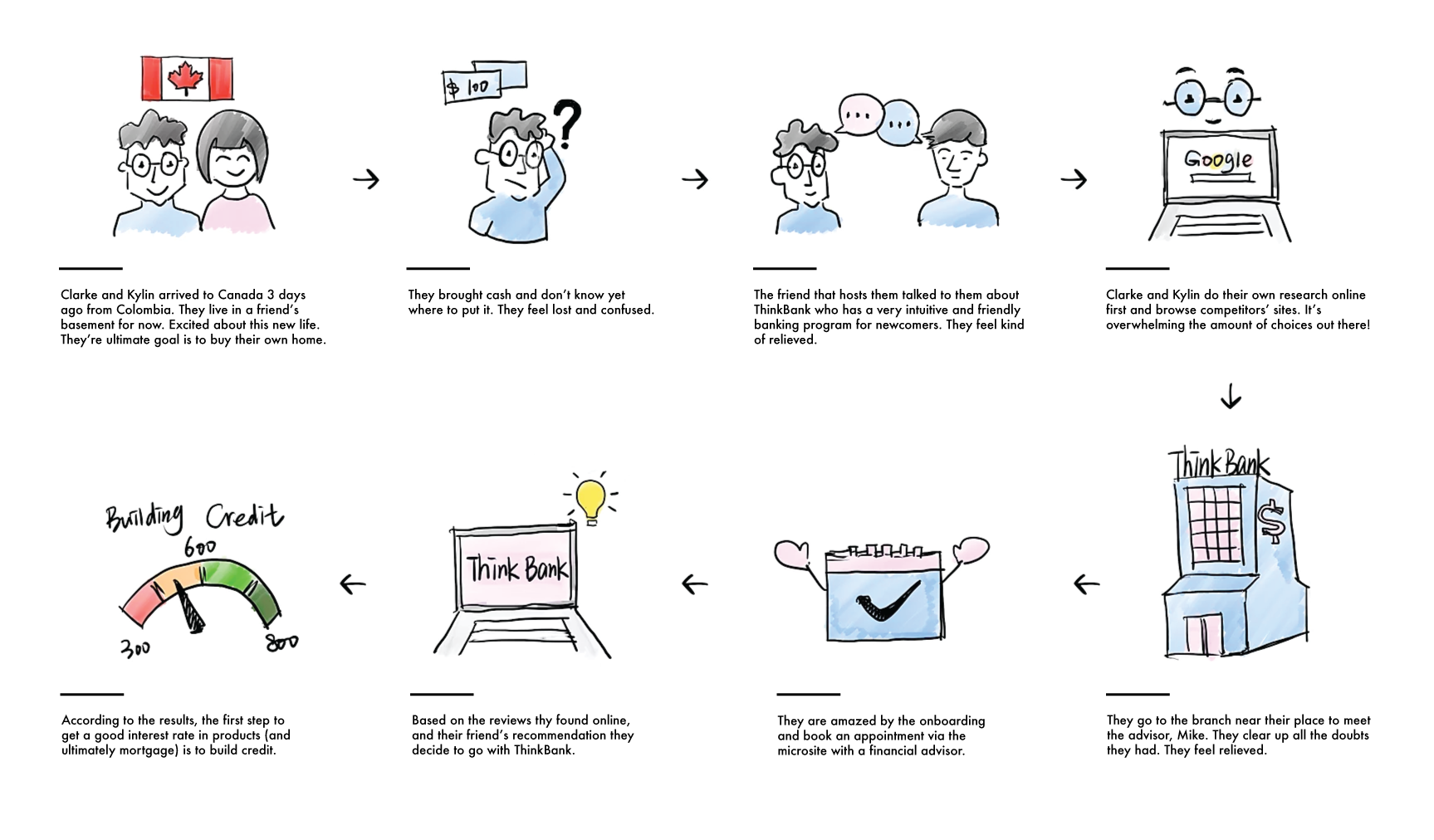 We created a potential solution to help newcomers like Clarke and Kylin transition into Canadian banking. We presented this solution to a panel from BMO including representatives from the marketing and design teams.